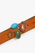 Buckle up. A wide, vintage-inspired leather belt with a chunky metal buckle detailed with turquoise, amber, green and pale yellow stones. The Jewelry Box is made from 100% cow leather in brown with subtle distressed details.