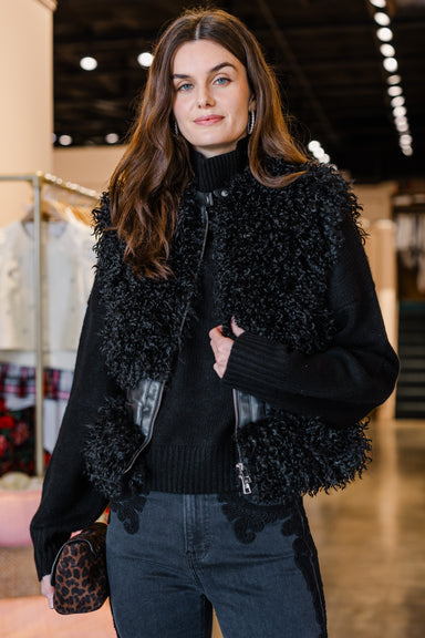 Model is 5'11" and wearing a size S Runs true to size Faux fur Faux leather paneling Size Chart