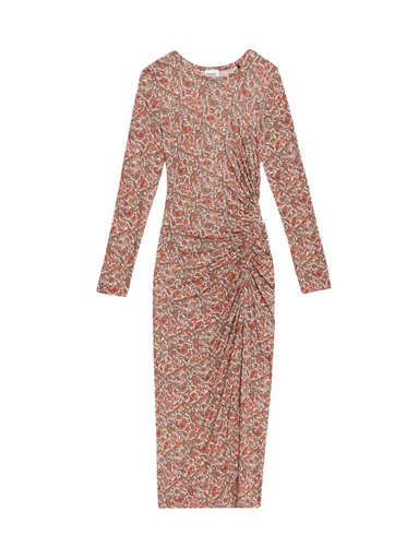 Long draped printed jersey tapestry pattern dress Round neckline with ribbed finishes Long sleeves Gathered front and shoulder Slit in front ...