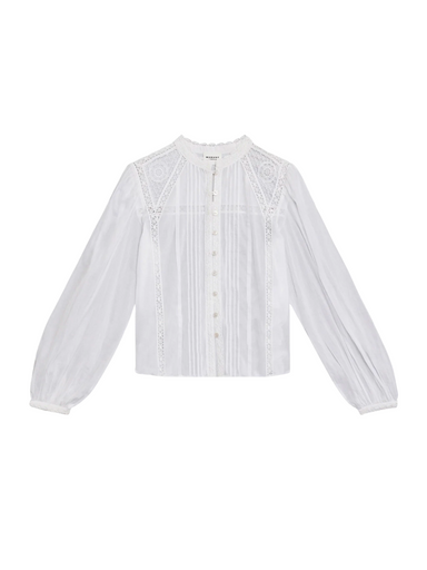 Lace and cotton voile blouse Round neckline with lace trim Openwork lace shoulder yokes Buttoned front Long sleeves with thin buttoned cuffs ...