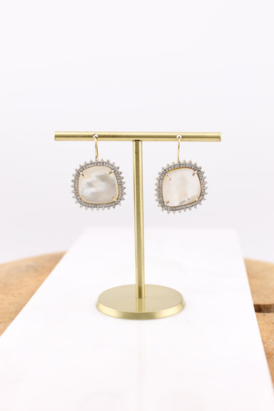 Mother of pearl earrings featuring pave diamond border Hook earring back Square-ish shape Measures approx. 1.25" long and 1" wide