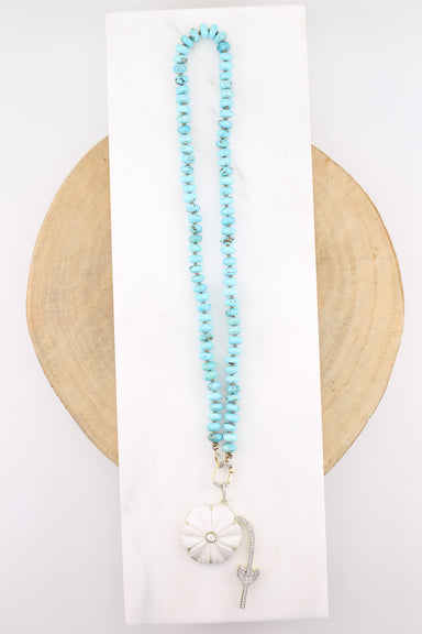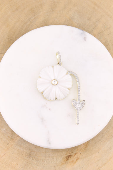 White agate flower featuring diamond center and pave diamond stem Measures approx. 2.5" long and 1.5"wide Necklace not included