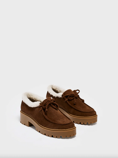 This lug sole loafer features a natural shearling trim, lace-up design and our twice-patented invisible insole. Material: Suede/Shearling Color: Mo...