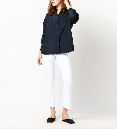 Cone stretch twill 88% cotton/10% polyester/2% lycra covered elastic waist cropped, flared leg 28" inseam on size S made in the USA machine wash c...