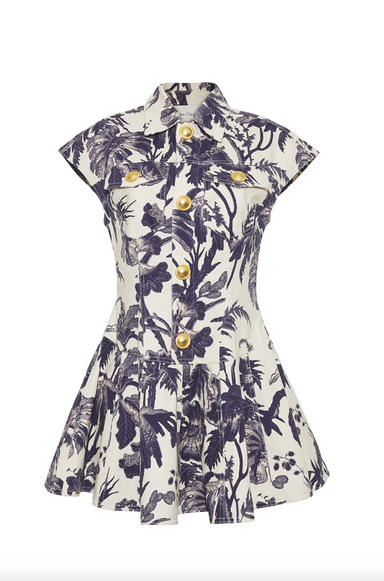 • Short sleeve, collared, button down fitted canvas mini dress with peplum skirt and seaming details throughout• Front and back yokes with function...