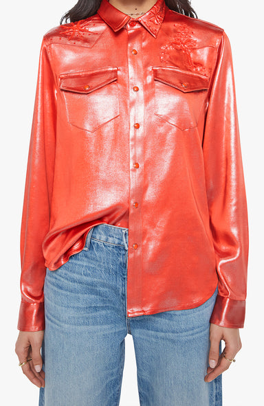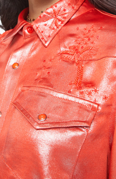 Western-inspired denim button-up with front patch pockets and a curved hem. Made from foil-printed fabric in red, Cherry Tomato features embroider...