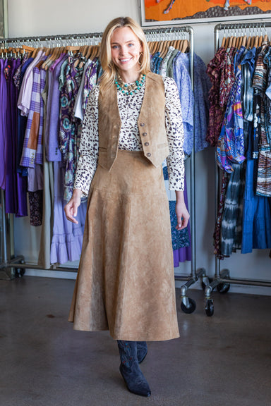 • Suede circle skirt• Fitted yoke with side seam zipper and snap