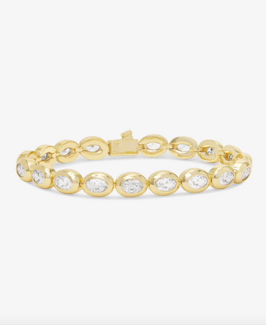 Tennis Bracelet Available in size: 6.5" or 7.5" Push Box Clasp 18k Gold Plated Over Brass Stone: 4x6mm Simulated Diamonds