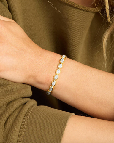 Tennis Bracelet Available in size: 6.5" or 7.5" Push Box Clasp 18k Gold Plated Over Brass Stone: Simulated Opals