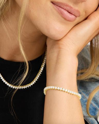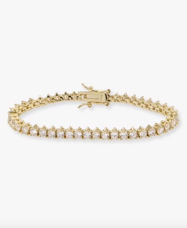 Tennis Bracelet Available in size: 6” or 7.5" Snap Closure 18k Gold Plated Over Brass Stone: 3mm Simulated Diamonds