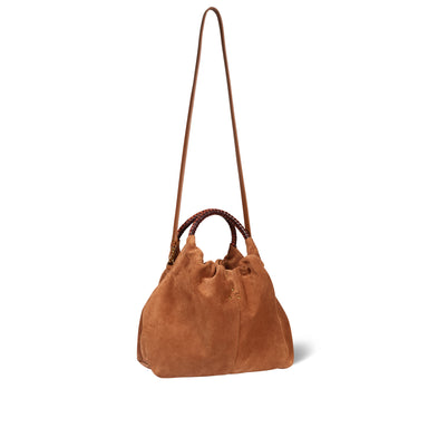 Dome-shaped frame pouch in espresso brown Italian suede with silver-stud embellishment. Features a tonal leather strap, frame closure, full lining,...