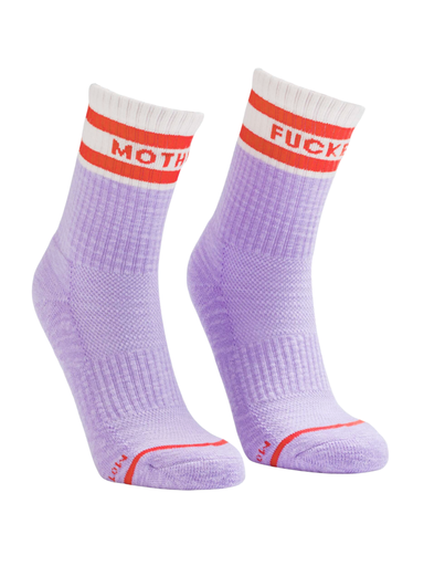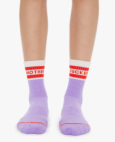 Watch your step. Classic tube socks with a bold message from MOTHER. Shown here in lavender and white with red lettering and details. Final Sale...