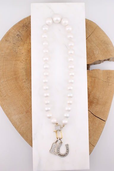 Freshwater pearl necklace featuring pave diamond horse bit clasp Measures approx. 18.5" long Pendants not included