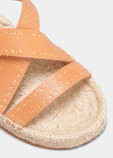 Mid-heel sandal in cacao suede with silver stud details. Features a latticed strap design, an adjustable sling-back strap with a buckle closure and...