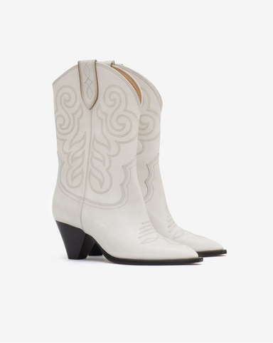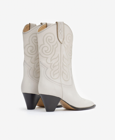 Mid-heel Western ankle boot in red vachetta leather. Features stretch gore panels, a padded leather footbed, a square toe, and contrast stitch det...