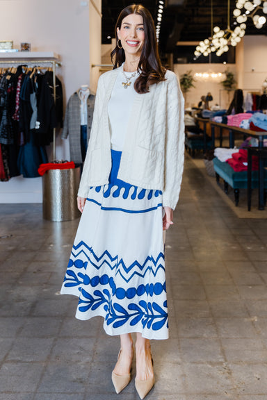 64% Viscose, 36% Rayon Juanita Swirl Indigo Button-up shirt Collar neckline Round tortoiseshell buttons Long flared sleeves Wide silhouette Band a...