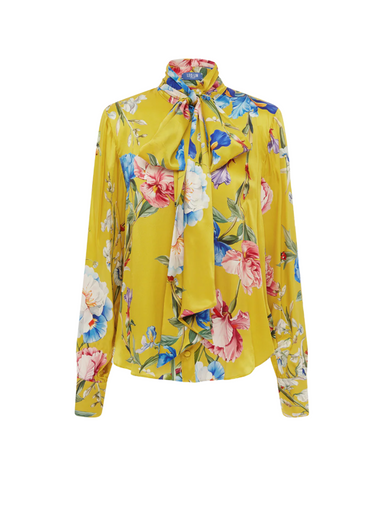 Premium silk tie neck blouse Exclusive LEO LIN in Joie Print in Snow High collared neckline with feature bow tie Front button opening Long sleeve ...