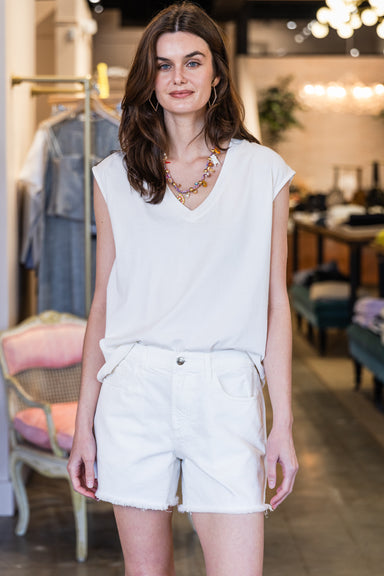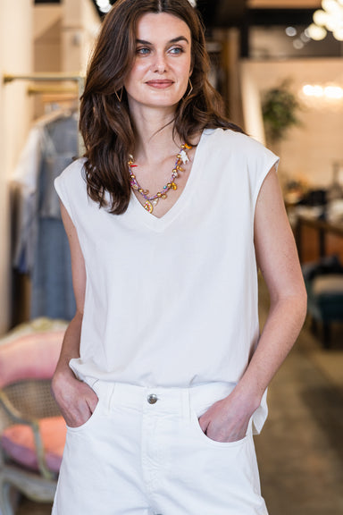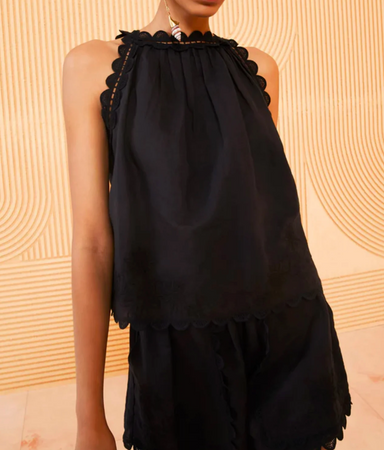 • Fitted V neck sleevelesstop• Ruffle and ruched details throughout