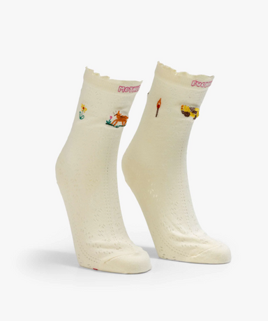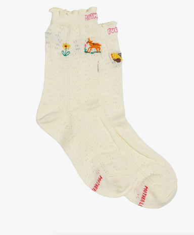 From cab to cabin. Tube socks with a message from MOTHER. Shown here in white with colorful embroidery throughout. Final Sale, No Return or Exchange.