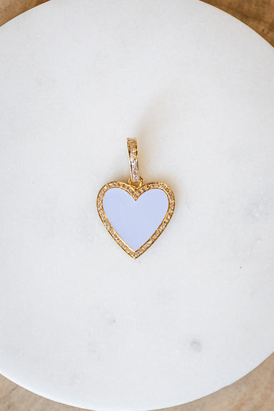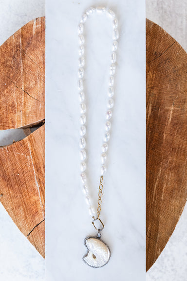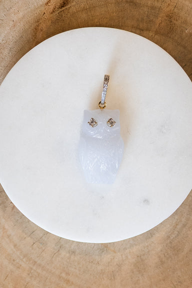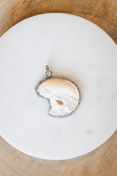 White agate flower featuring diamond center and pave diamond stem Measures approx. 2.5" long and 1.5"wide Necklace not included