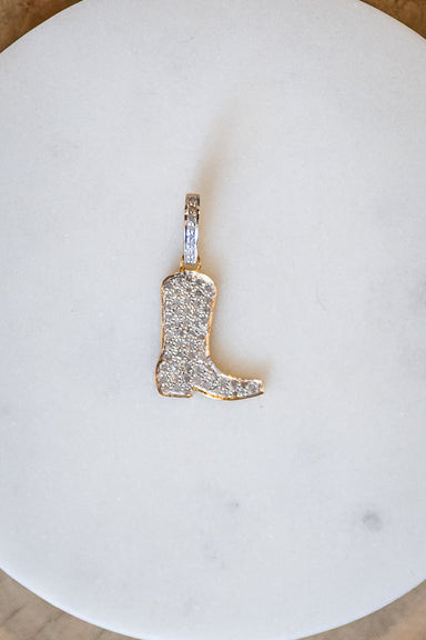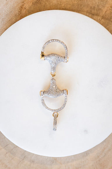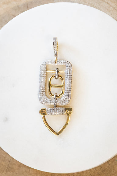 Horseshoe pendant featuring garnet triangle cut outs and pave diamond details Measures approx. 2.5" long by 1.5" wide Necklace not included
