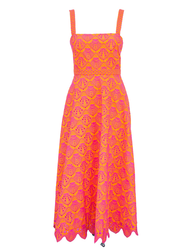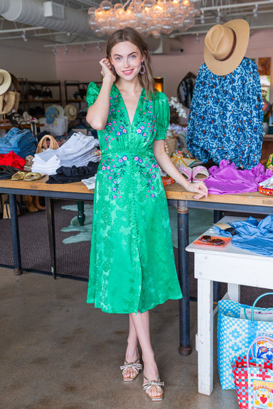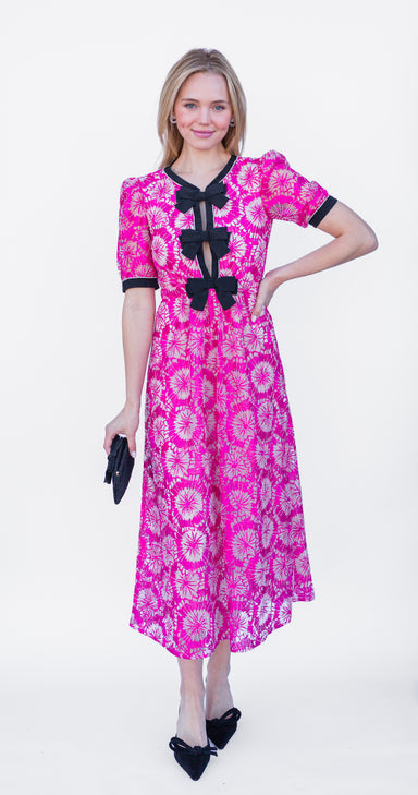 Textured cotton midi dress Mandarin collar Centre front placket with gold knot buttons Bow detail on sleeves Fitted waist Fabric-covered belt Gath...
