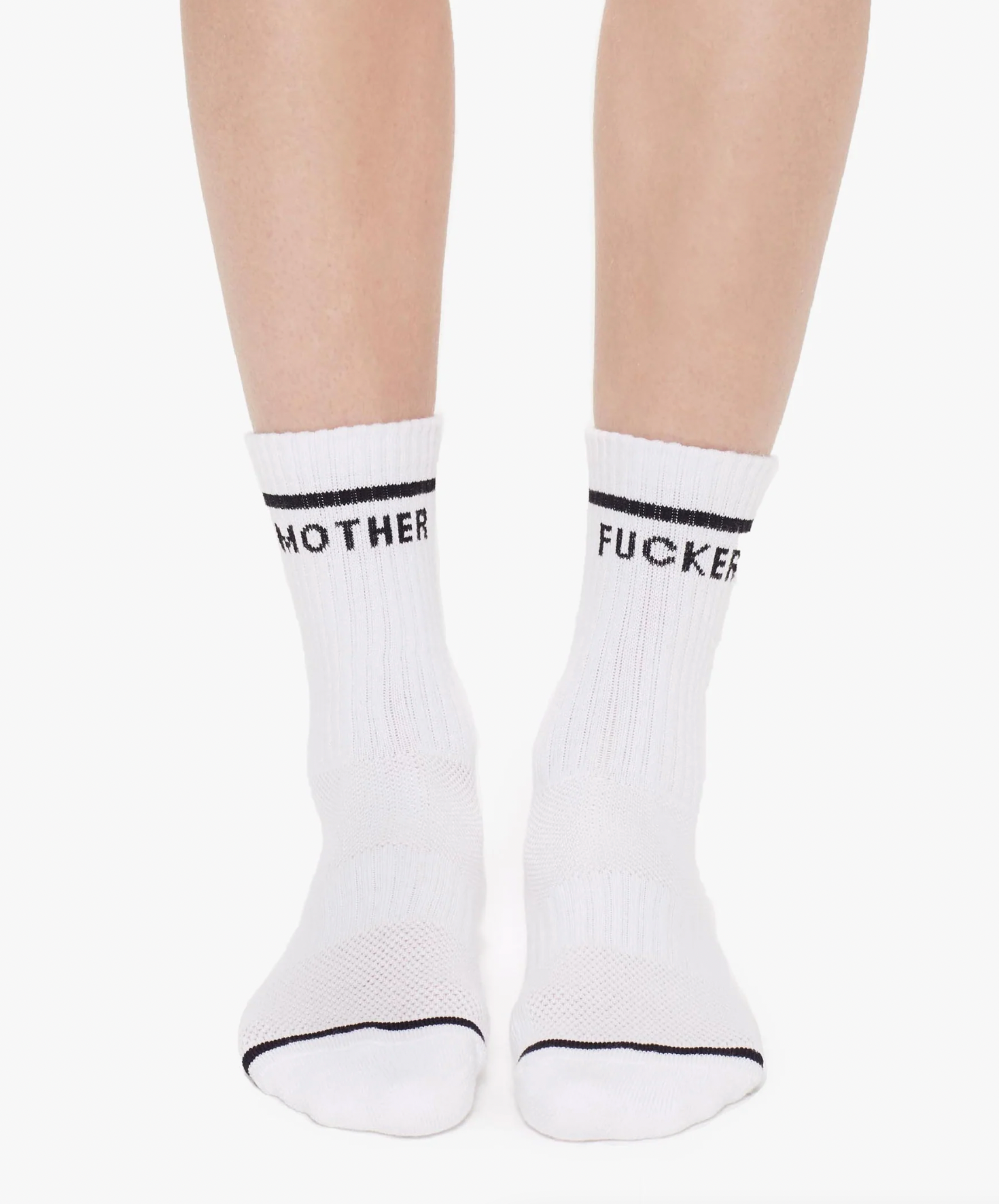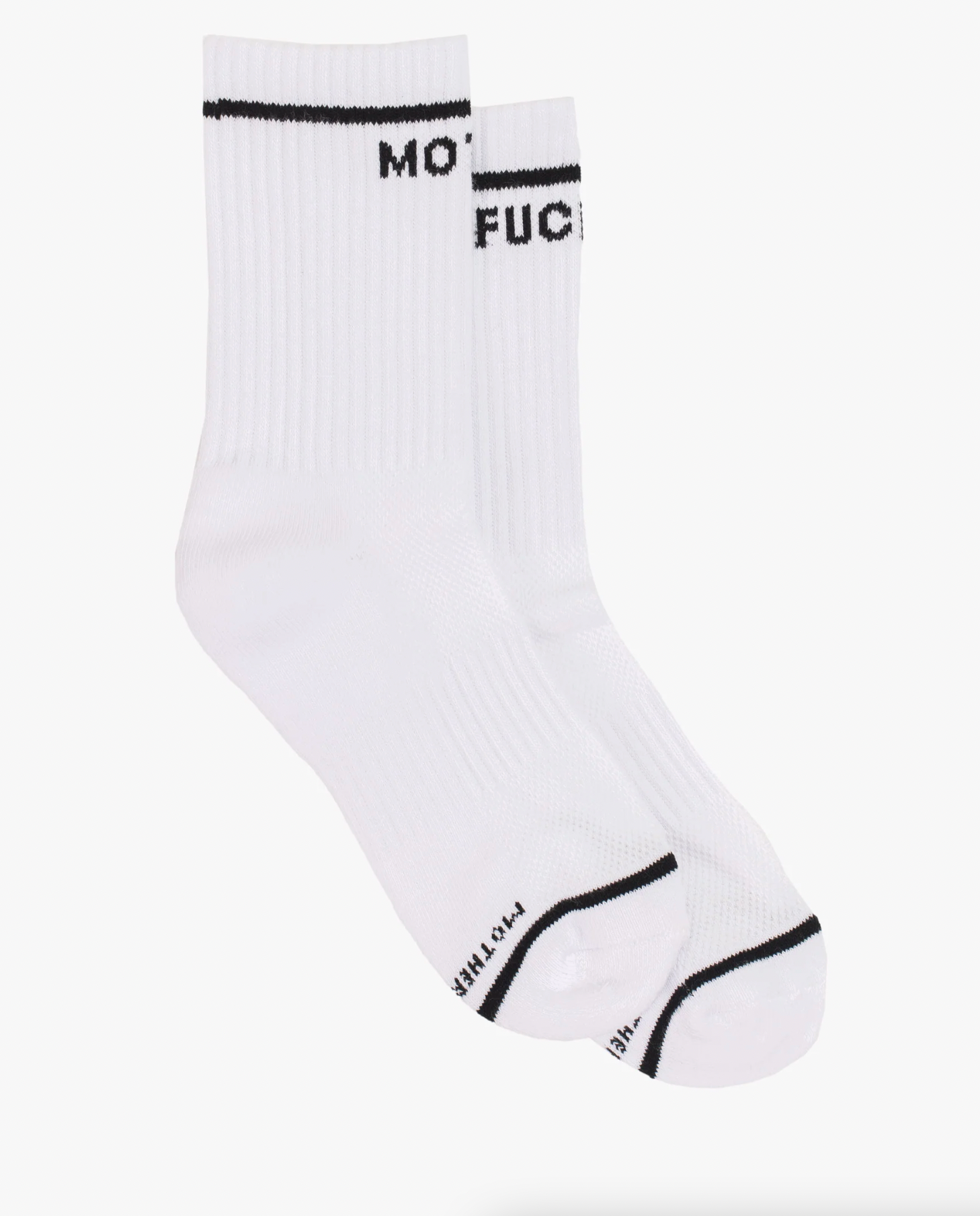 MOTHER will knock your socks off. One minute salty, the next sweet, she swears to always keep you on your toes. Her knit stockings are her best-kept secret with a vintage inspired, tube style and bold lettering.
