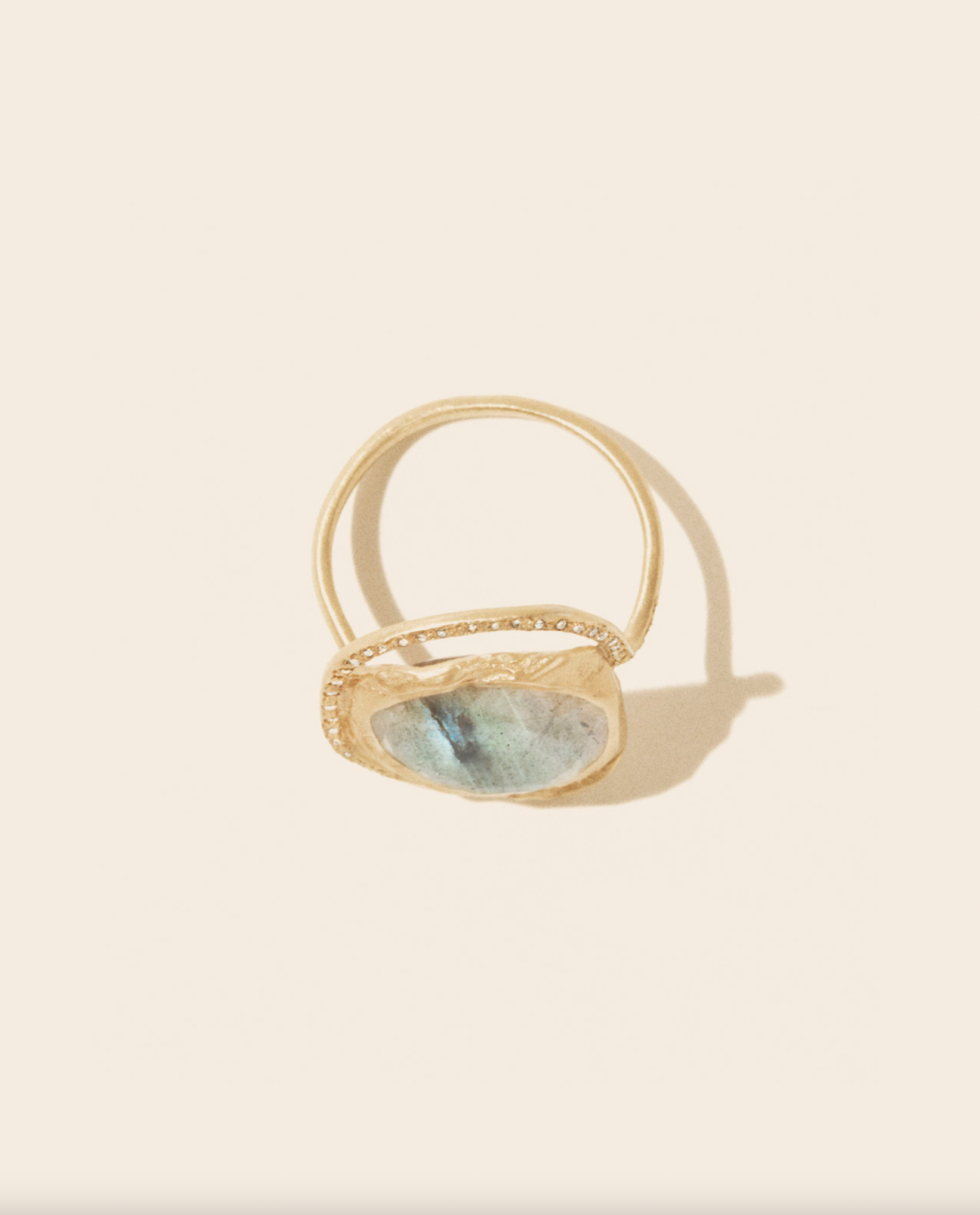 The Earth Mother goddess Gaia inspires jewellery with distinctive stones. These treasures of nature are unique: rutilated quartz shimmering with shades of straw, labradorite with bronze hues, or turquoise with its variations of blue and green. As a ring, a row of diamonds takes flight to wrap around the hammered gold. As a necklace, the stone is enhanced by small inlaid diamonds.